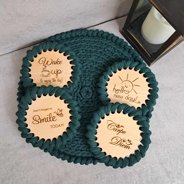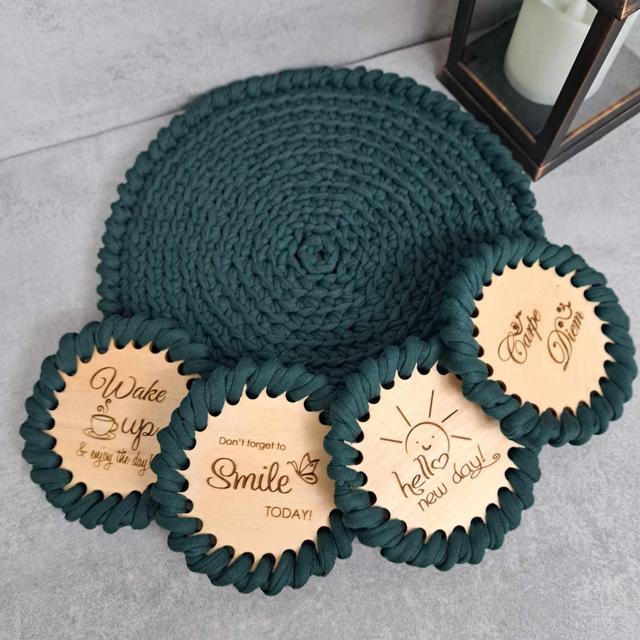 Material: kvačkani so iz reciklirane t-shirt preje. Osnova podstavkov za kozarce je lesena, premazana z mineralnim oljem in vgraviranimi različnimi motivi.
