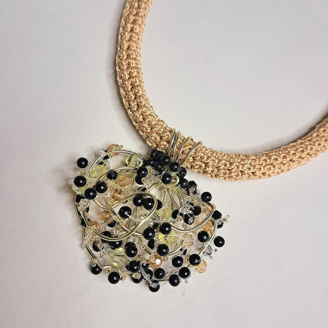 Posebnost ogrlice je umetniško oblikovan obesek iz nežne žice, prepletene z drobnimi kristali v črni in zlatorumeni barvi. Ta igriva, a hkrati sofisticirana kombinacija barv pritegne pogled in doda pridih glamurja.