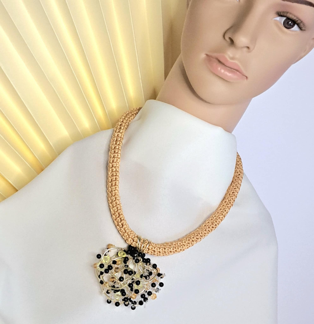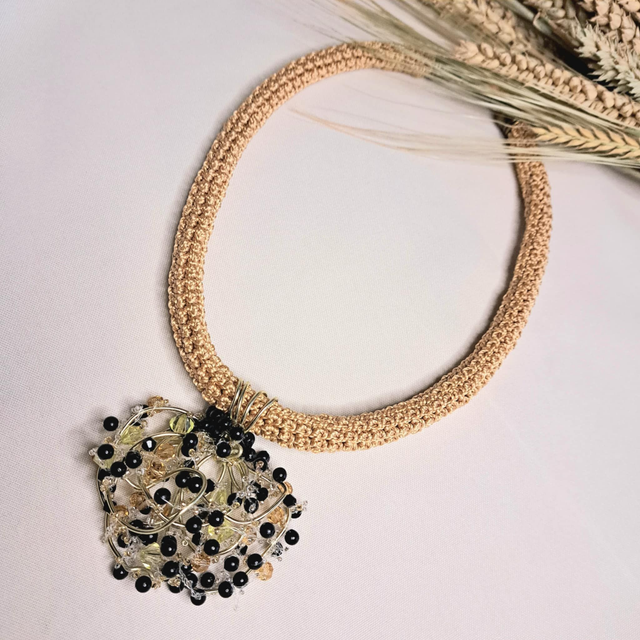 Ta ročno izdelana ogrlica je prava kombinacija topline in prestiža. Kvačkana osnova v zlati barvi daje ogrlici prefinjen, a hkrati moderen videz, ki se lepo poda tako k elegantnim kot tudi k vsakodnevnim opravam.
