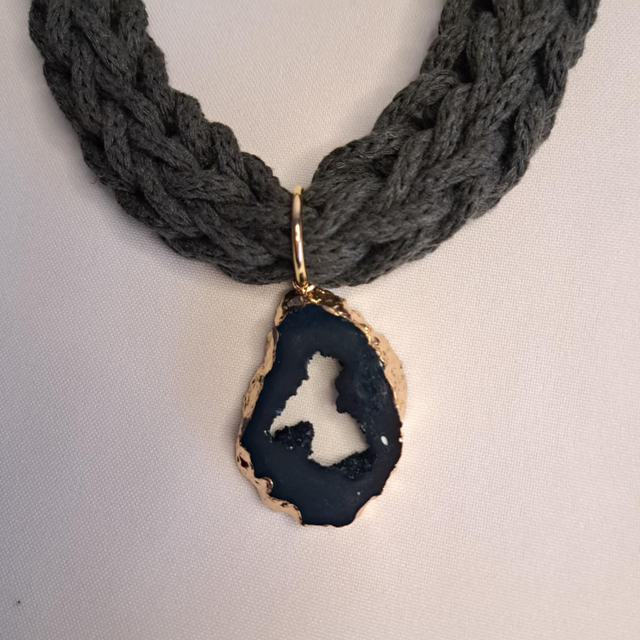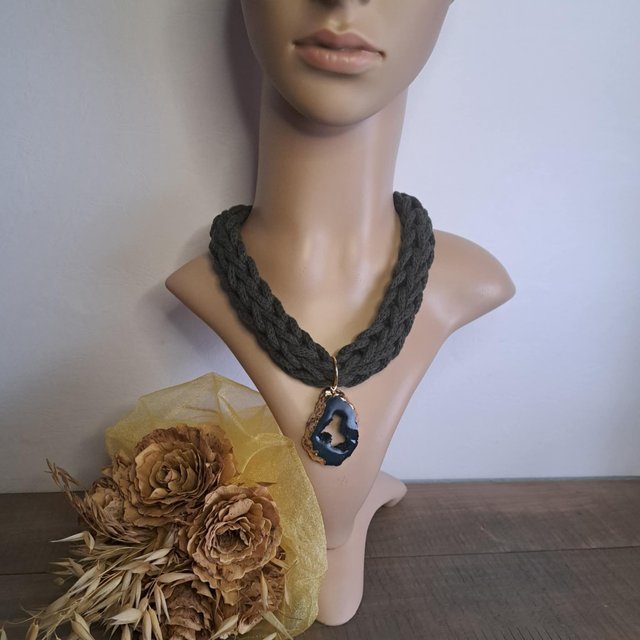 Združuje naravo in eleganco v najglobljih tonih. Ogrlica je ročno kvačkana iz olivno zelene bombažne vrvice, ki daje občutek topline, zemlje in videz rustikalne elegance. Obesek v slogu geode pa prinaša moderen, drznejši pridih, zaradi katerega ogrlica izstopa tako v minimalističnih kot trendovskih kombinacijah. Ogrlica za ženske, ki ljubijo minimalizem, a z močnim karakterjem.