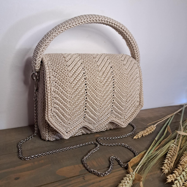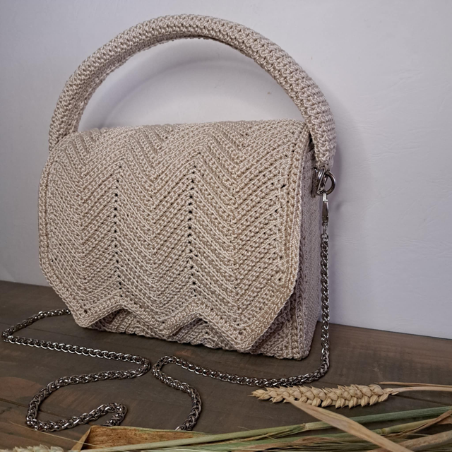Ta unikatna ročno kvačkana torbica je popoln dodatek za vsako priložnost. Njena nežna bež barva in prefinjen vzorec v obliki cik-cak linij izžarevata eleganco, medtem ko kovinska verižica doda pridih sodobne prefinjenosti. Popolno darilo za nekoga, ki ceni ročno delo in eleganco.